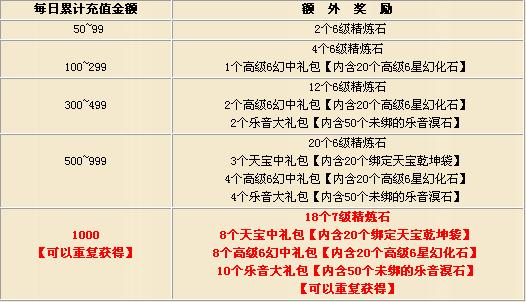 活动内容:在活动时间内,官方将对每天的充值账户以及金额进行统计。充值达到一定数值的时候,会得到官方额外的奖励,详细请看下表。