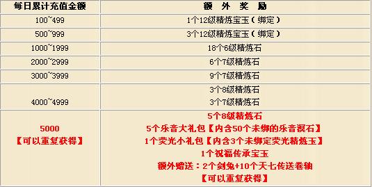 ② 活动2中5000元的的奖励道具是可以重复获得的。例如:充值10000元即可获得10个8级精炼石、10个乐音大礼包【内含50个未绑的乐音溟石】、2个荧光小礼包【内含3个未绑定荧光精炼玉】、2个祝福传承宝玉、4个剑兔、20个天七传送卷轴。