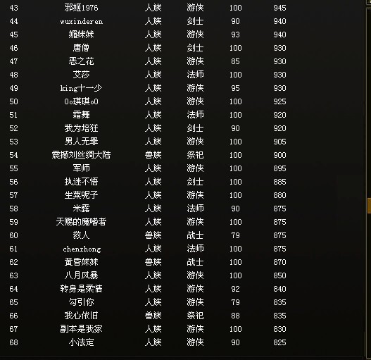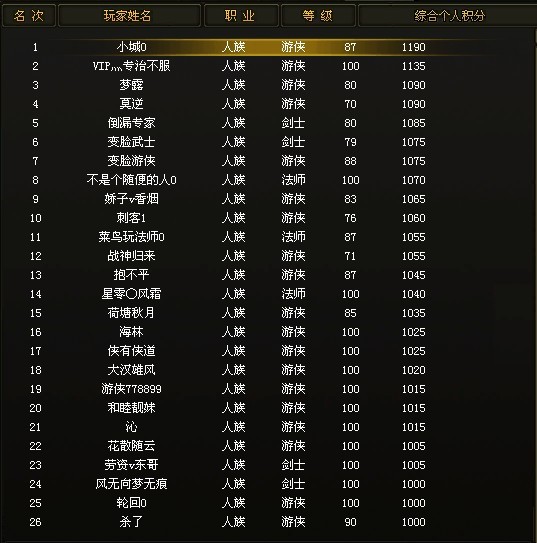 淡定!淡定!淡定!从上边的看。分析就能得出人的这边积分高,不过有点平均,刷积分的都是极少极少个人,要是说刷积分,总会比较明显个人的高积分的。班主你认真的看下上边的数量级吧,就能理解发贴的心理在哪里了?无非是想改成一职业独大,不可否认玩人的这边的人数占优,上边的100名中有96人。((本来我们都是人,从选职业时,心理上就有优胜权了,谁会去选一个兽兽玩?难看毛又多,二个脚趾,黑不流秋的,动作也不好看(个人观点)))。唉!*,真的无语,不理解人的心理。
