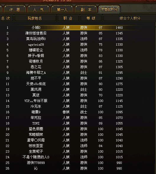 这荣誉战是论积分的。。又不是说牛叉就得了的。你牛叉没得积分有屁用啦。论级别得积分?论装备得积分?论旗和剑座还有采血和杀人得积分的,这个表有什么好看啦?你没得积分就是排后边去。*!!!!