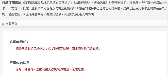朋友,我回复,我是问过相关事宜之后才回复的。问的事情,可能是你不知道的。而且我没有任何必要把其它玩家提交的信息过多的告诉其它玩家。官方查询信息,LZ可以提交什么什么东西没有了。如果查询是异常消失,官方会管的。但是很无奈的是,并没有查询到对应信息。如果官方那边出现的问题,我想官方很乐意为此及时处理并最大程度降低玩家损失。但是通过他反馈的信息,官方是并没有查询到他想要的结果。线下交易,弊端我就不多说了,但是线下交易的来源,金额,我只是说对官方来说没任何意义。童鞋,您可以理解正确了么。我们不是不玩游戏,但是不得不说,对于你们这些专业玩家来说,我们更重要的是需要管理官方论坛版块。可能确实在有些地方上没你们来的专业。但是我们愿意做大家与官方之间的桥梁。而且我相信,版主是有积极的意义的。只是童鞋在以偏概全的以一个“否”的感觉来看我们的任何一个文字。我们跟帖,是针对LZ发帖的内容。我没有任何必要和跟帖人争锋相对。如果你是热心人,不妨让他再完善信息重新提交申请。
