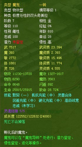 首先是宠物的选择,宠物分商店,野外和商城宝宝三种。这三种最根本的区别在于转身后的灵魂链接不一样。灵魂有关系到宠物转生后把自身能里加到主人身上的多少,所以很重要。商店宝宝灵魂连接上限是4,最多可以把自身的8%加到主人身上(物理宝宝是加攻击,魔宝宝加魔攻,防御加物防。灵动加魔防)野外宝宝是5,但BOSS掉的是6。商城里的除刀锋是7其他都是六。再来谈谈属性,防御和灵动宝宝个人觉得不用看属性。物理宝宝需要金木土三属性(须要注意属性只是关系宝宝群攻技能的问题)。魔宝宝则不能是这三种属性才能学群技能。潜力当然最好是完美为好,但如果资质好的,个人觉得杰出也可以养到三阶看结果,如果能把潜力提到完美最好。这里需要注意,宝宝在开始只能鉴定潜力不能鉴定悟性。因为潜力进化中可以提升,悟性鉴定后不容易提升,也就不好开洞学技能了。如果你鉴定是高那我恭喜你,没影响。如果是低,在高的资质没洞你也只能哭。这些说完就是成长度了。虽然现在商城有血舍利可以加成长,个人觉得成长还是越高越好。说这么多最后总结下宝宝选择一看潜力(杰出和完美),二看属性三看资质,四看成长(最少9W以上)。