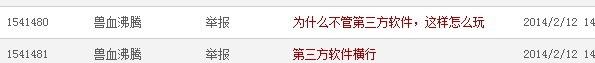 我们大家都相信客服对第三方软件打击的力度,,在这样的情况下,,这两个号还是不顾客服对游戏的态度,让大多数玩家的公平何在!如果不永久封这两号,,我们会60个玩家集体删号。就当我们投入的人民币,看清了百游的态度!!!请版主转达,谢谢!