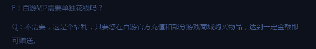 [p=28, null, left]F:百游VIP需要单独花钱吗?[/p][p=28, null, left]Q:不需要,这是个福利,只要您在百游官方充值和部分游戏商城购买物品,达到一定金额即可赠送。[/p][p=28, null, left]请问斑斑 这个部分游戏商城购买物品 怎么解释?? 解释给我看看[/p]
