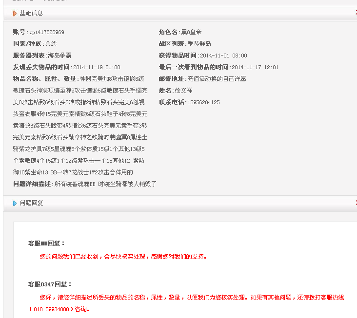 您好,请您提供您所丢失的物品的名称、数量、属性以及宠物的等级、阶位、转生次数以便为您核实处理,请按照要求提交问题。如果有其他问题,还请拨打客服热线(010-59934000)咨询 你们就只会这么说嘛?我东西那么多 你让我在一个问题里面提交?你们不会看我的数据?要是不想帮我找回就直接说 我不会把你们怎么样 大不了不玩!我花钱还会玩不到游戏? 你们看看我的充值记录!在看看我的数据不就什么都知道了?非要我提交这个提交那个 提交了还要我什么统一提交一个问题?我提交了你们解决了?