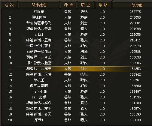 原味内裤游侠号基本还能秒杀了我们100W防御,490W血的战士,我们兽族战力前20的祭祀,猎人基本是被他秒杀的