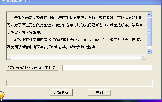 右键单击桌面兽血沸腾的游戏图标选择“属性”,可以看到“起始位置”栏,把“起始位置”后面的地址复制到上面,再点开始更新就可以了