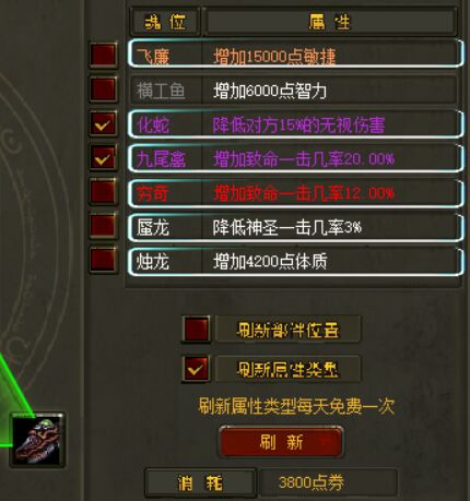 刷新封灵属性同时,根据锁定条目不同,赠送天晶石等奖励。使用一定数量的天晶石可免费刷新封灵属性,实际还是3800点劵的意思,只不过根据童鞋锁定条目不同,返还的天晶石奖励也会不同,童鞋再用天晶石锁定刷新就相当于是五折了