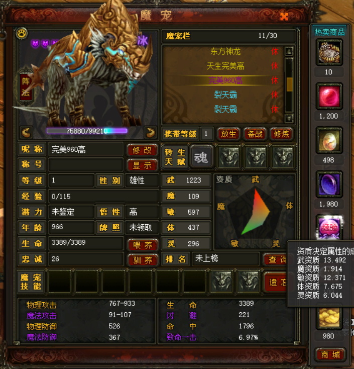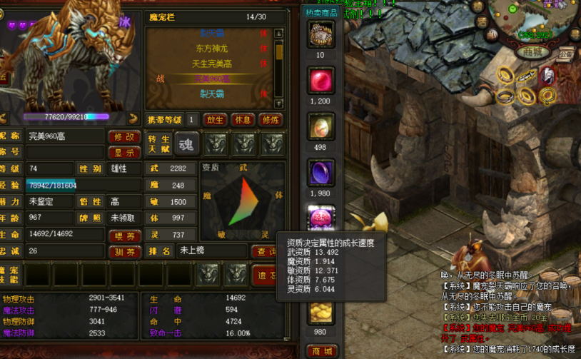 宝宝在1w5成长的时候武资质是11.xx,现在消耗7w5成长了,武资质才13.492。就算最开始是一般低,练到现在也不应该就这一点资质,更何况本身种子就是完美高的,全程就潜力跟悟性就提了一次。