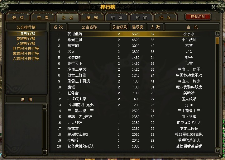 大家来看看这个十八区彩玉城我很低调的会昨天我发过帖子了才2级47个人已经很奇怪了今天就54个人了 这个工会在彩玉还是排名第一还领奖了!