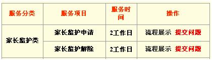 服务分类当中有两项服务项目:家长监护申请和家长监护解除,服务时间为2个工作日(不含法定节假日、周六日)点击提交问题如服务项目:家长监护申请