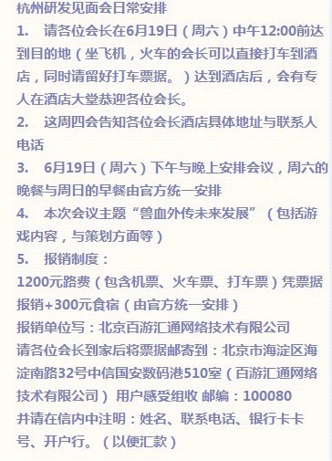 【补充一点】:如若仅仅报销1500元。但是,安排组织玩家在杭州免费旅游一天。。。那效果就是天壤之别了。。。好好想一想,对不对?!组织玩家:游西湖,登六合,观钱塘……可以浓墨粉饰,大肆宣传。那么百游此次活动。就是“奇胜”。---完美。(1500元都丢出去了,还在乎一日游的200元吗?)