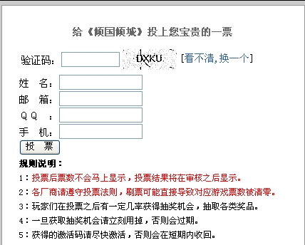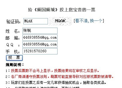 2、输入正确的验证码、姓名、邮箱、QQ号、手机号码后,点击投票按钮。如下图: