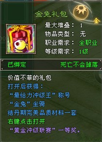 金兔礼包:“最给力冲级王”称号 、“金兔”坐骑 、完美材料包(结丹)1个 。