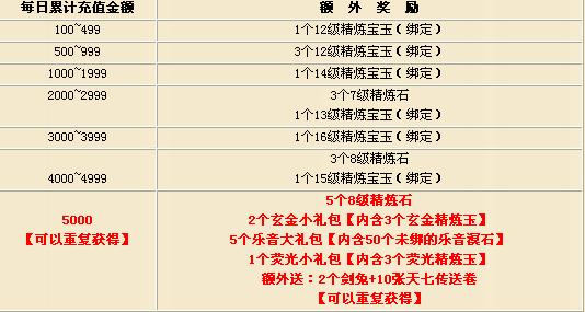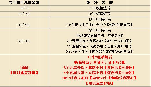 活动内容:在活动时间内,官方将对每天的充值账户以及金额进行统计。充值达到一定数值的时候,会得到官方额外的奖励,详细请看下表。