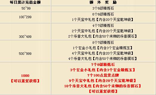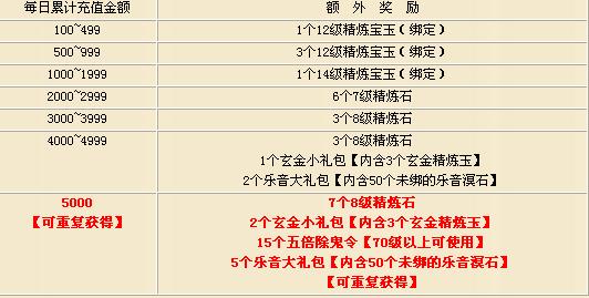 ② 活动2中5000元的的奖励道具是可以重复获得的。例如:充值10000元即可获得14个8级精炼石、4个玄金小礼包【内含3个玄金精炼玉】、30个五倍除鬼令【70级以上可使用】、10个乐音大礼包【内含50个未绑的乐音溟石】。