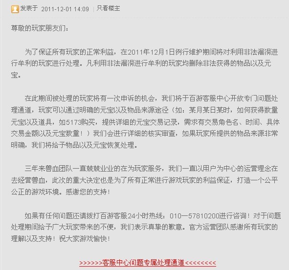 支持你的正义,真的希望官方真正做到公正公平,不要让玩家失去对您公司的信任。游戏出现漏洞。是玩家的错误吗?无故封号,无故清空玩家元宝,身为官方,可以肆意你们权利。。。。。。那只有让深信你们的玩家也慢慢远你而去。。。肆意的做法,最终受损失的还是柏油吧。。。。