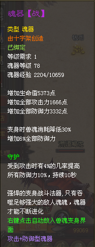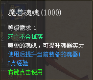反映[魂器]吃[魔兽魂魄]升级 点击烦琐的问题 请看如图所示 78级的[魂器]要想升级到100级,需要吃接近30组[魔兽魂魄],组的单位是1000个,每个[魔兽魂魄]的经验是10点,每组必须用鼠标点击1000次,1000乘以30=3万次,这会使玩家的手指尖-情何以堪,建议改为;可以将[魂器]放入背包后,合理拆分足够升级用的[魔兽魂魄],直接将玩家选定的足够升级数量的[魔兽魂魄],直接可以放入[魂器]被吞噬并获得相对的经验。谢谢了!