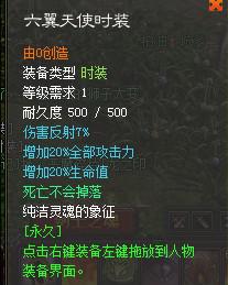 下面,我来介绍下”六翼天使“是否是本次更新的败笔!?原混乱、罗马时装18%生命换成六翼天使之后增加了2%生命,满打满算,一个100万血的玩家多增加了2万这个样子。14%全减意味着被对手攻击10000伤害将降低1400伤害,7%反伤意味着被对手攻击10000伤害后将反射700伤害,统计过吗?7%剑伤是所谓的极品属性?你们还将14%全减给取消了!你们研发这样的时装就如此的自信?能值10万点卷? 我们这个区见到了这样垃圾的时装属性,没有第2个人去花10万点卷来买了,你们可以继续这样让玩家心灰意泠的!
