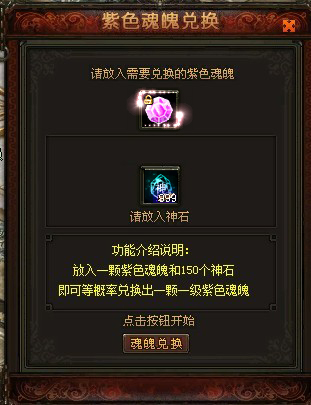 我们可以将紫魂魄+150神石放入"紫色魂魄兑换"界面,会必定换得一颗稀有的紫魂魄.