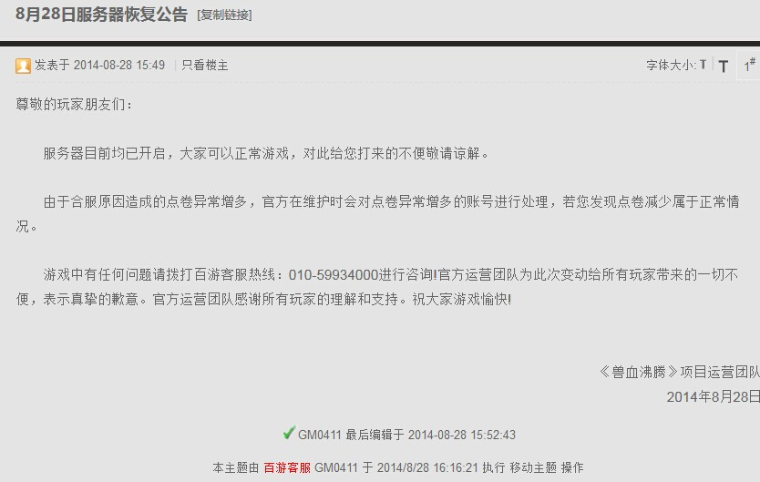 游戏中有任何问题请拨打百游客服热线:010-59934000进行咨询!官方运营团队为此次变动给所有玩家带来的一切不便,表示真挚的歉意。官方运营团队感谢所有玩家的理解和支持。祝大家游戏愉快!