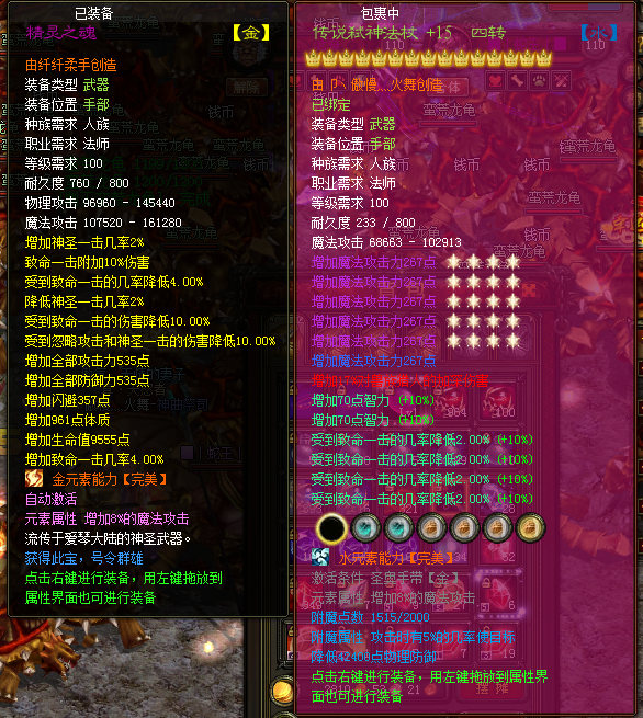 原来带4转15的武器攻击是50多万,换了神器之后攻击没有增加还降低了10多万,打人的时候神器的效果还是有的比4转15的武器厉害