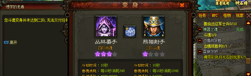 我是人族游侠号,,,但是我点的是猎人之魂,学的技能也是猎人的。。。所以变身也是练的猎人之魂的。。。任务显示是黄色的。。我去交任务不是要点一下那任务,那也显示黄色的。意思也是可以完成任务。再点那任务就显示你斗魂变身并未到达二阶,无法交付任务???