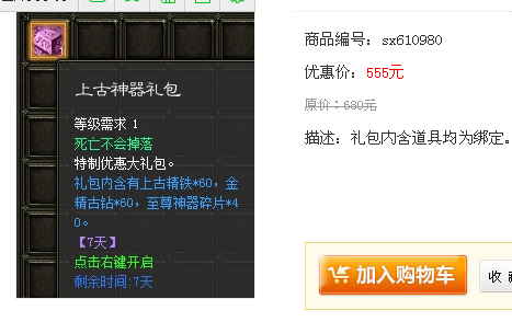 这个上古神器礼包精铁60个 精钻60个 神器碎片40个 卖555元 精铁 精钻3块一个 60*3=180*2=360块..神器碎片现在3块钱一个 40*3=120 也就是说着上古神器礼包最多值360+120=480RMB 再说了对于能出110神器的玩家 你们觉得会缺神器碎片吗?*