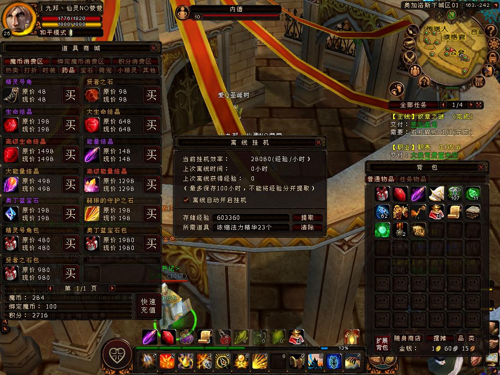 28080/小时/21小时/603360经验/需法力精华23个/一个48魔币共计1104魔币
