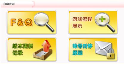 自助查询类分为四个板块:分别为FAQ、游戏流程展示、版本更新记录、帐号停封原因。