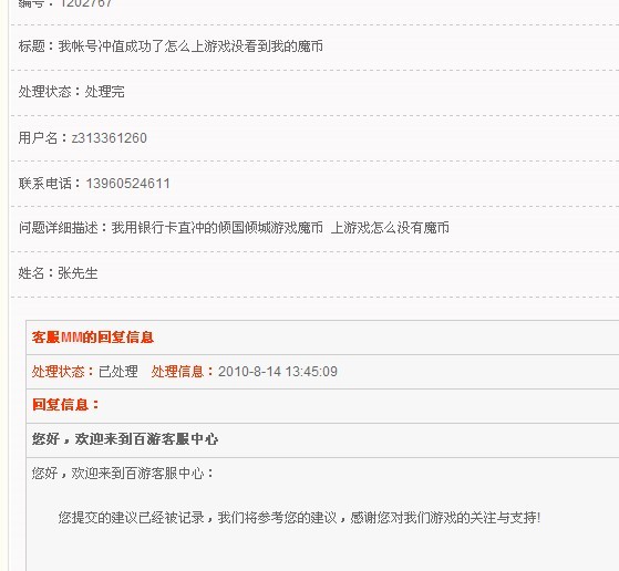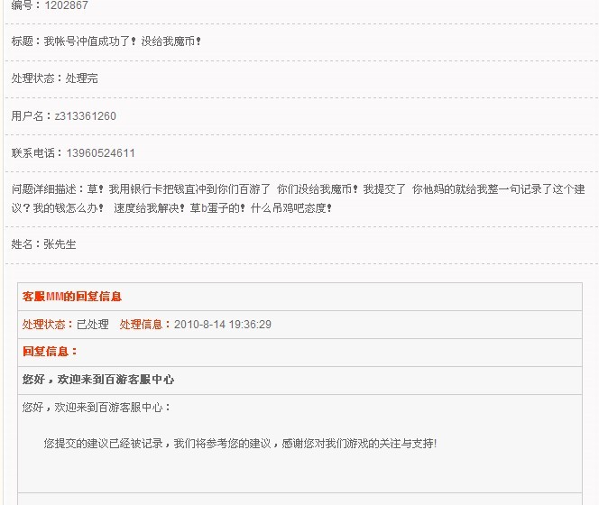 我14号用网上银行直冲的 钱是当时就扣了 然后魔币到现在没给我 我去查冲值记录也没!打电话到客服是没有人接过 一直说客服全忙 你们客服是不是根本没人啊!打了几十个电话 没一个能接的! 还有我在线提交 给我的答案就是这样 这就叫处理完成?!草你麻痹的!踏雪 小馒头 这帖子先别删 先把问题解决了爱删不删都行 搞得我火大了!