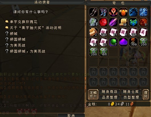 我对客服很无语。8天前提交的问题、现在都还没处理下。集字抽奖。我没想拿什么奖。只是各人玩游戏的兴趣爱好不同。我喜欢打宝、打架。升级都不喜欢、看见美字是25副本最后个BOSS掉落的、。一是我天天去刷。有天早上终于爆了个美字。我开心死了。留在身上2天了才去换。结果NPC告诉我。我的任务物品不足。我郁闷了。不知道该怎么办、。又等恶灵2天还是这样、。我于8号的到客服反映问题。现在几号我不多说了。到现在还没给个回复。有照片为证、其它的字。我都300-400个。一直没换过花。我的单号。1228568没反应有找、结果下一单号1228557 。在找1228556。活动都结束了问题都没处理哎。不能换就直接说下。无所谓的。就2个蓝或许血。还有个摆摊的BUG。本来我只喜欢玩游戏。从来不喜欢发贴。这个游戏我忍不住了。摆摊的重**UG。不知道有多少玩家有像我一样的遭遇。买了个商业卷。这样摆摊可以放的东西多了。人物身上带满东西去摆摊。结果又的材料是50个一组的。我把东西方上去卖的时候。发现还有空位。我把50个的材料分开。分成10个一组。结果是。我摆好摊想收摊就起不来了。显示背包空间不足、我强制下线。重新上游戏后。我后面的装备材料都没了。人物身上是满的、人物少摆摊的空格,少几格,后面的装备材料就没几样、、第一次是先摆装备。然后在把材料分成10块一组。我也没发现少多少。我材料太多了。后面那次。我先摆了材料、最后才摆装备。这次死了。摆好后又显示人物背包空间不足。压根起不来。什么方法都试了没用。后面的装备我点退出。人物一下子站起来了。可是身上只剩材料。装备全部没了。