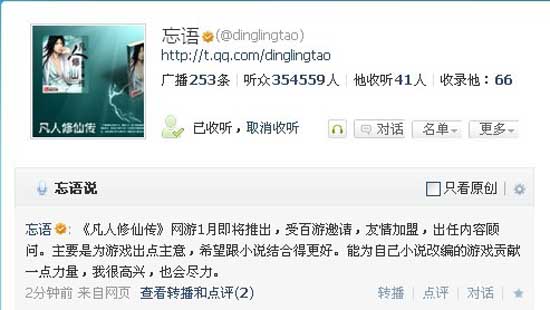 告诉大家一个好消息:起点中文网白金作家、《凡人修仙传》小说作者忘语已经加入游戏项目团队,出任游戏内容顾问,负责把控游戏与小说内容契合度方面的工作。