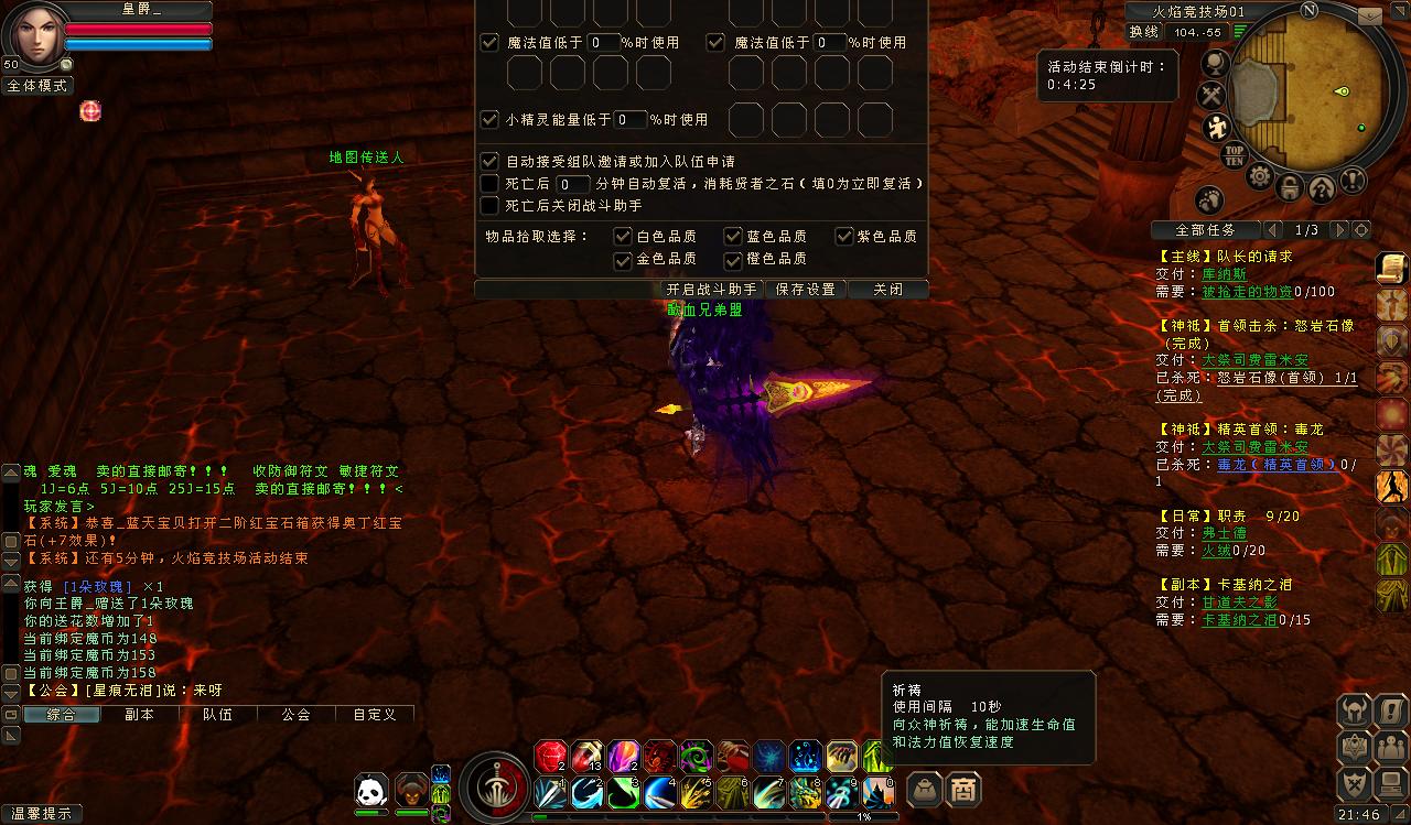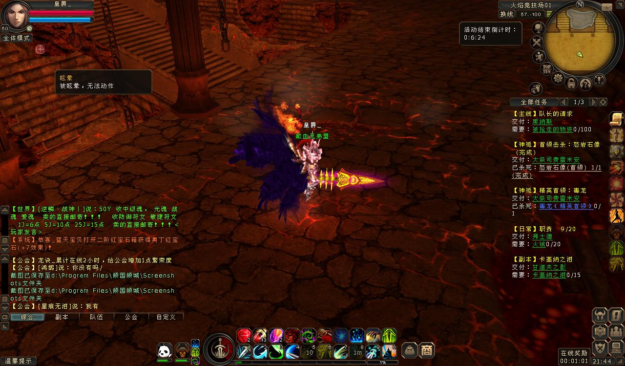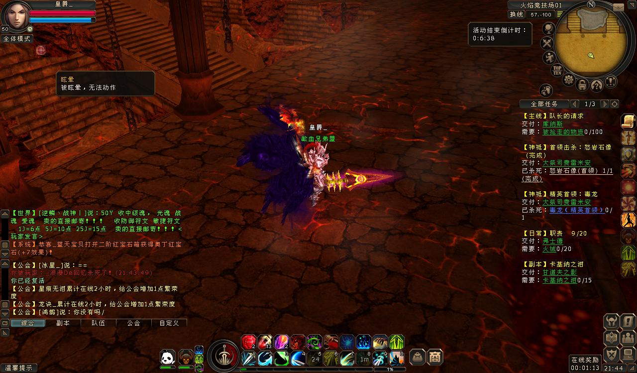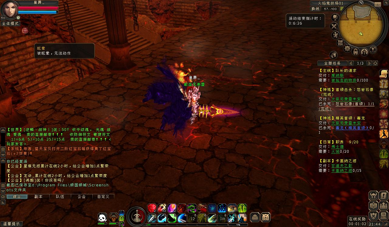 在火焰竞技场,被人打死的瞬间被他晕了一下,复活以后就一直在晕,没时间限制,再死再复活依然在晕,除非活动结束或下线,否则就当靶子吧……还有,服务器掉线后我再上线发现战士的挂机到了屏幕上方,拉不下来,又不能设置技能和定点,郁闷额,求解决……