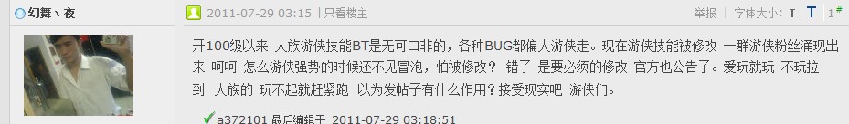 这个要是一开始就这样设置,你们还有意见吗?本来技能就是给你们PK用的。对角色起效。没有不合理吧?难道你打人一下,在到边上打个怪吸几万。这样叫合理?你们游侠本身就是攻击型的。还要辅助加攻击,对其他职业也太不公平了吧? 比如几个S族装备比你们游侠好,就是因为你们躲在怪物堆里面打不死。这样有意思?说句公道话。凭什么别人15*猎人就打不过你们13*游侠?凭什么?