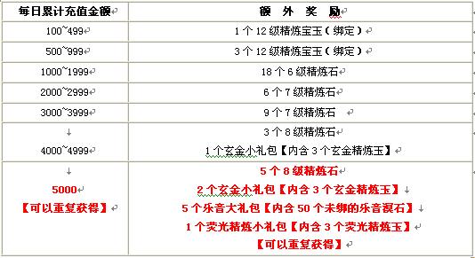 ② 活动2中5000元的的奖励道具是可以重复获得的。例如:充值10000元即可获得10个8级精炼石、4个玄金小礼包、10个乐音大礼包【内含50个未绑的乐音溟石】、2个荧光精炼小礼包【内含3个荧光精炼玉】。